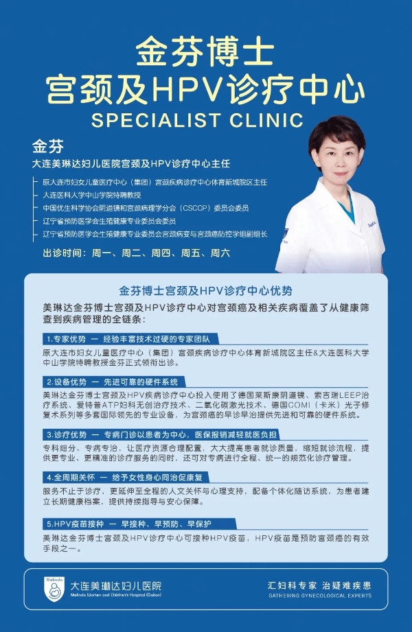为帮助女性解决宫颈疾病困扰并给予专业的治疗,美琳达特设宫颈及HPV疾病诊疗中心,致力于成为女性生命健康的一道坚实壁垒。由原大连市妇女儿童医疗中心(集团)宫颈疾病诊疗中心体育新城院区主任、大连医科大学中山学院特聘教授金芬出诊。门诊严格按照国际国内指南及专家共识进行规范操作,对宫颈癌及相关疾病进行精准筛查,倡导精准筛查、分层管理,制定了一套规范的诊疗流程,节省就医时间,提高患者的确诊率和治愈率。